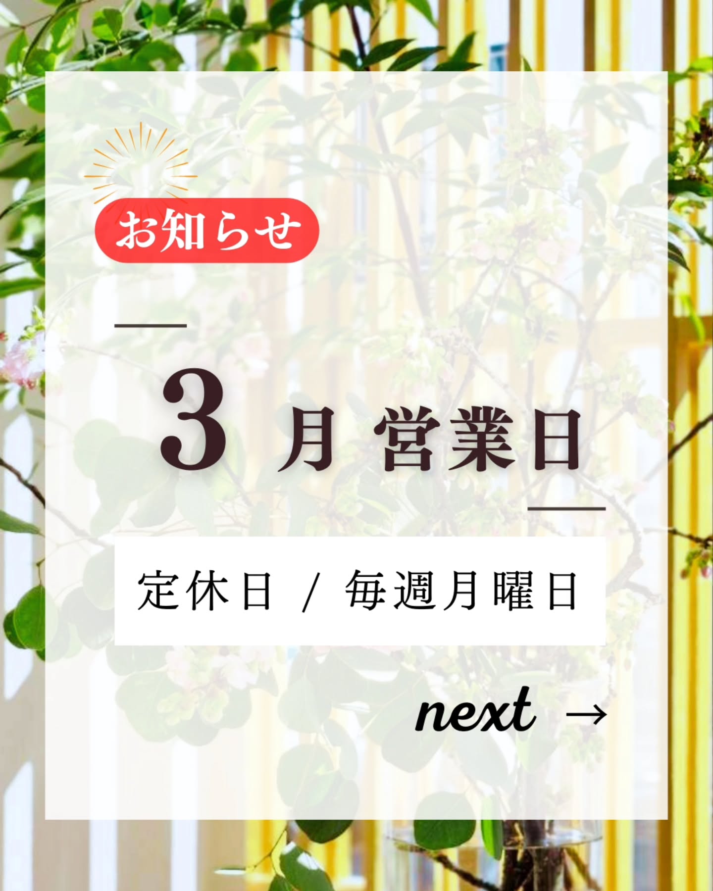 【 休業日 】・3/24(日)・毎週月曜日(定休)…